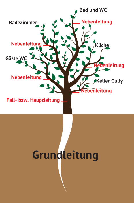 Der Stamm ist die Fall- bzw. die Hauptleitung, die dann in die Grundleitung läuft. Die Grundleitung sind die Wurzeln des Baumes.